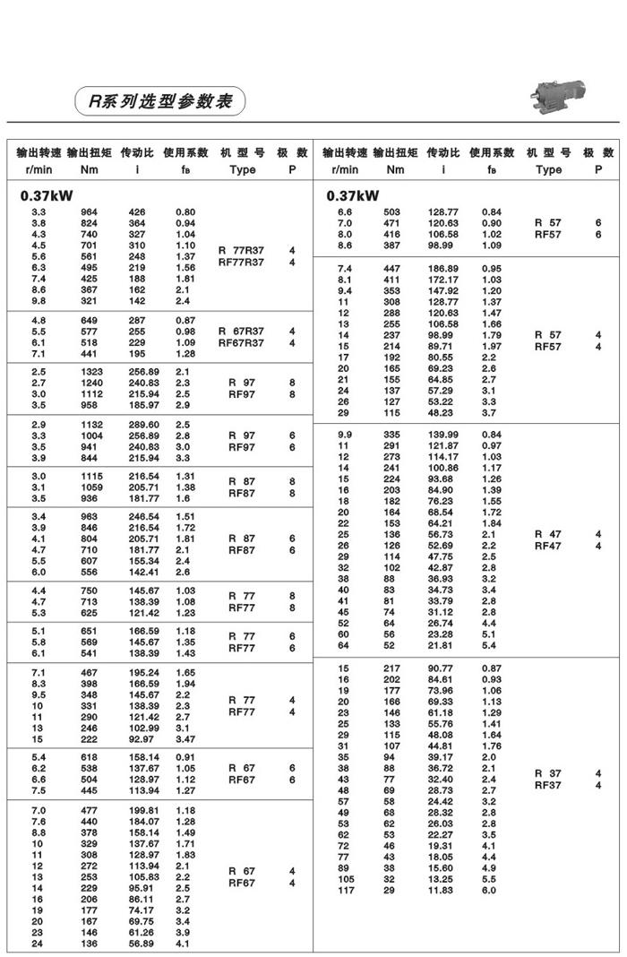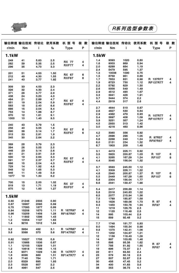 性能、特點: R系列斜齒輪減速機,結合國際技術要求制造,具有很高的科技含量,節省空間,可靠耐用,承受過載能b高,功率可達132Kw,能耗低,性能優越,減速機效率高達95%以上,振動小,噪音低,節能高,選用優質鍛鋼材料,鋼性鑄鐵箱體,齒輪表面經過滲碳淬火,經過精密加工,確保軸平衡度和定位軸承要求,形成齒輪轉動總成的減速機,配合各類電機組成機電一體化,完全保證了產品的質量。