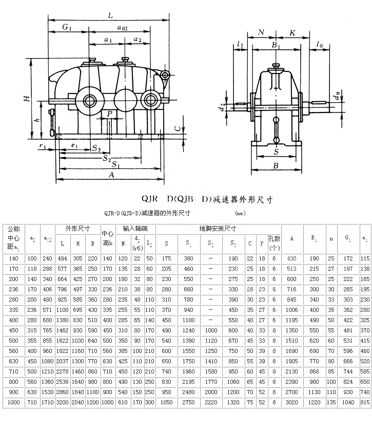 1)結構型式  QJ-D型減速器分為:QJR-D(QJB-D)型為二級,QJS-D(QJC-D)型為三級。QJRS-D(QJD-D)型為二級安裝尺寸三級速比。